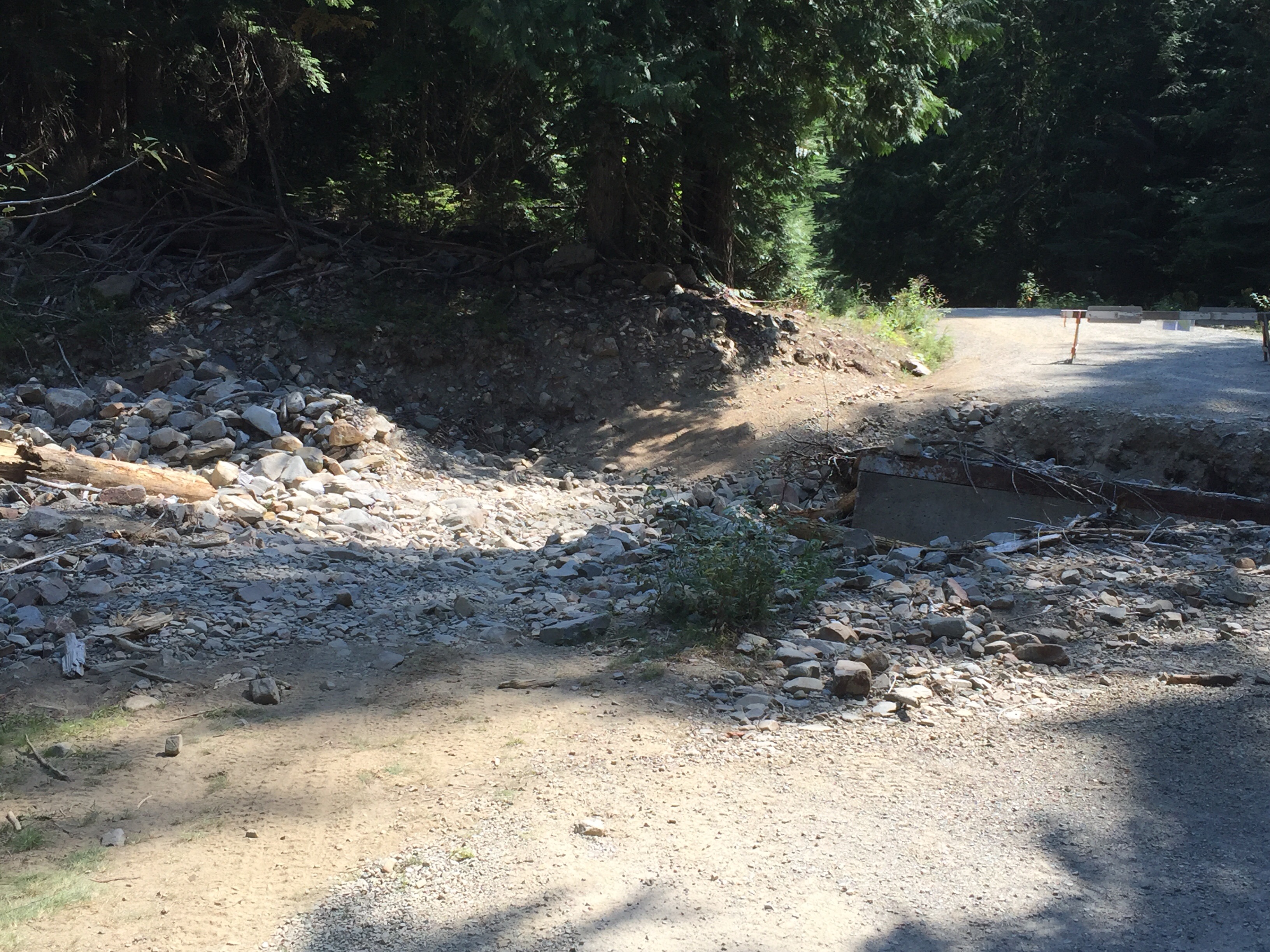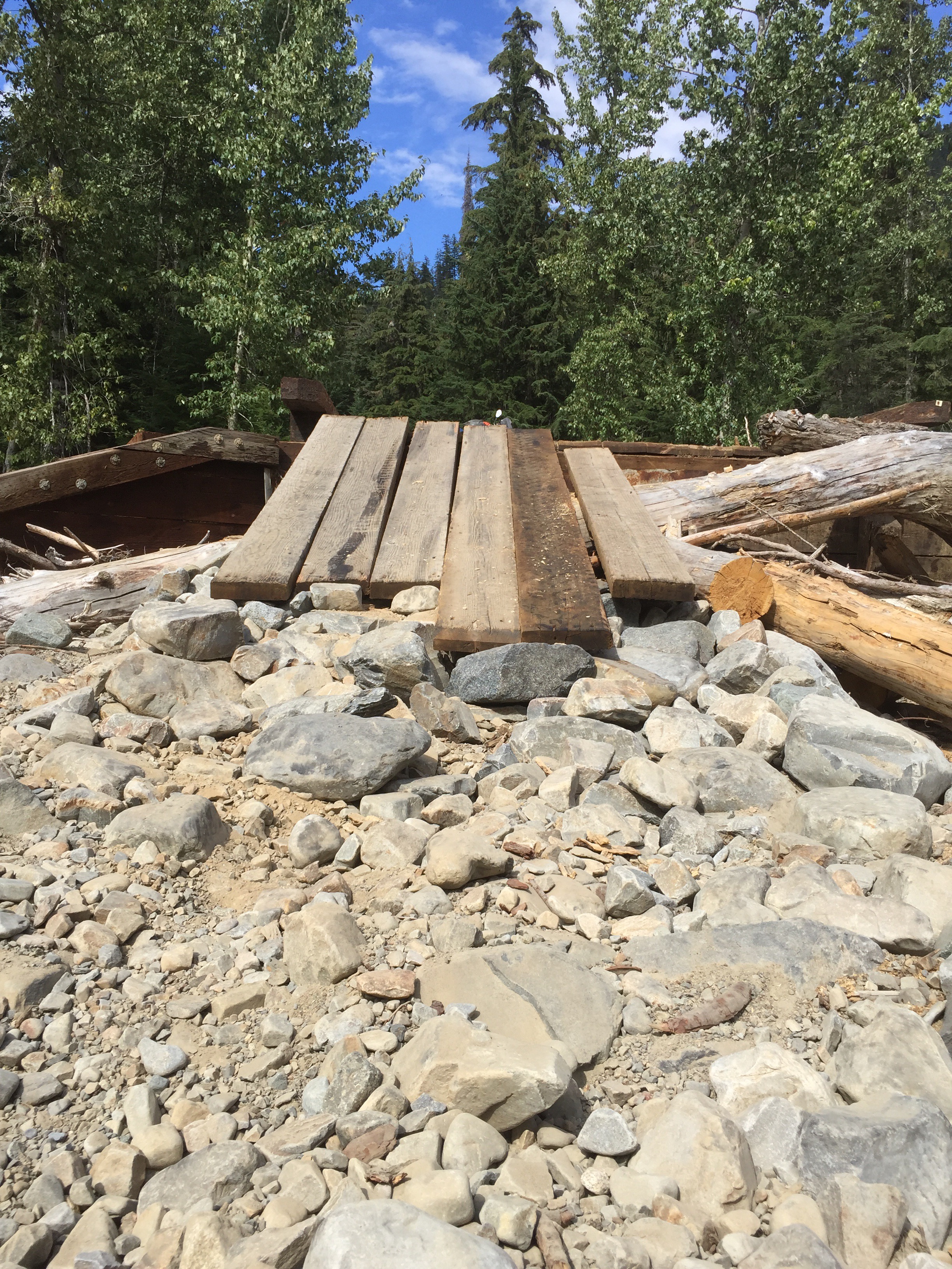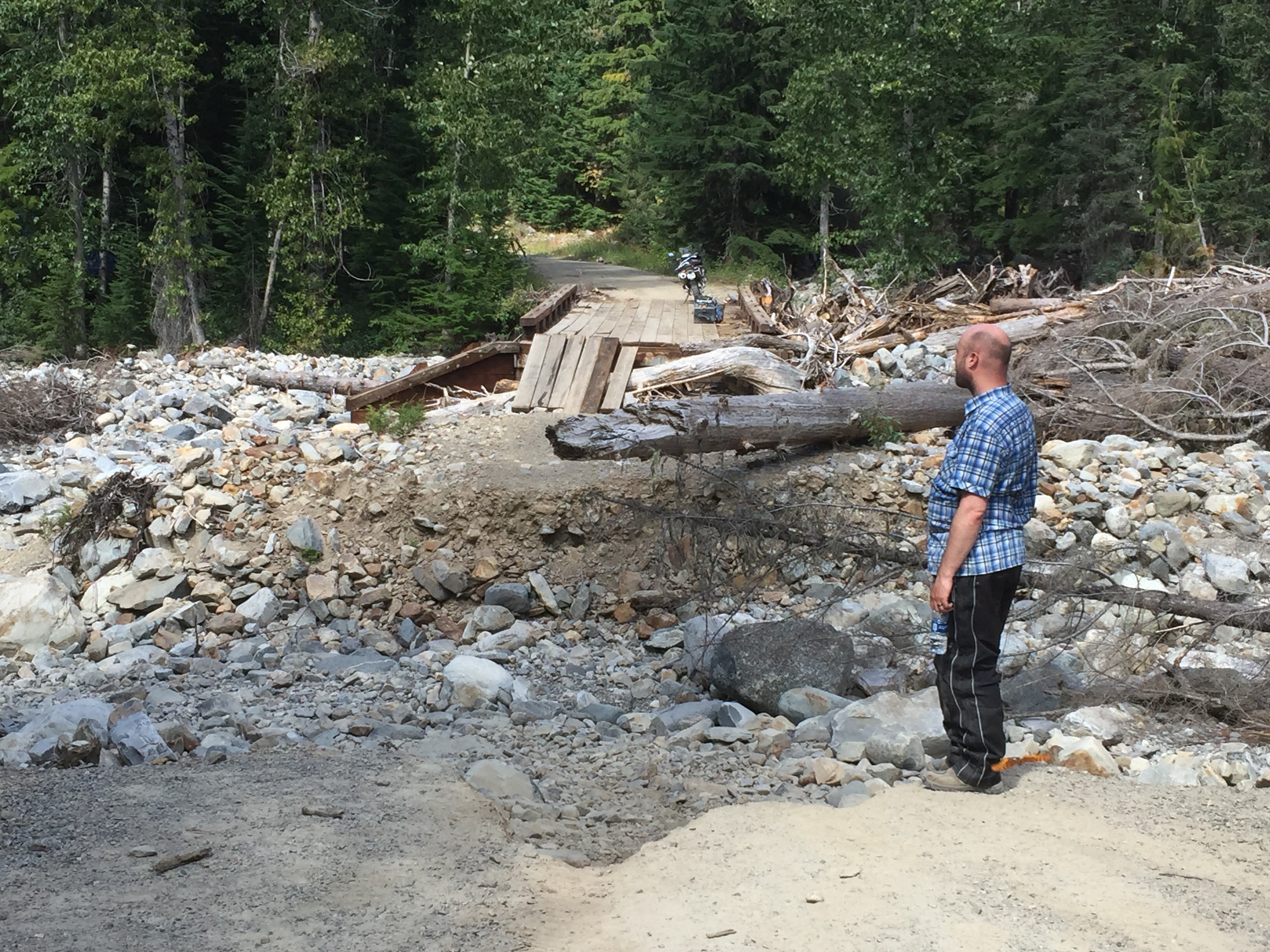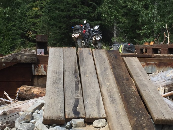 All in all, take your time, have some luck and you’d make it. The final washout, which we had seen pictures of, lived up to the difficulty we read about and some other riders told us. It was much larger, rockier, deeper and had a sketchy climb out onto the bridge someone had made with lumber from the original bridge. Here’s what it looked like after we got Marks bike across. That’s a couple foot drop where Mark is standing.