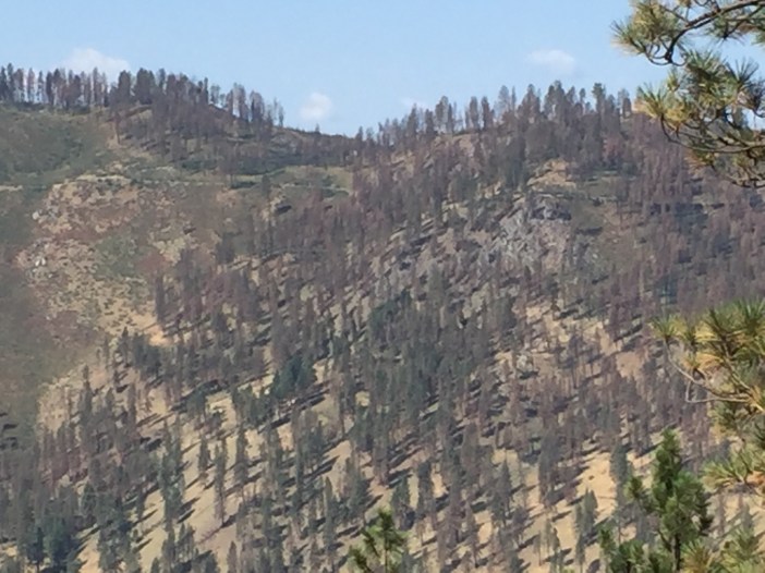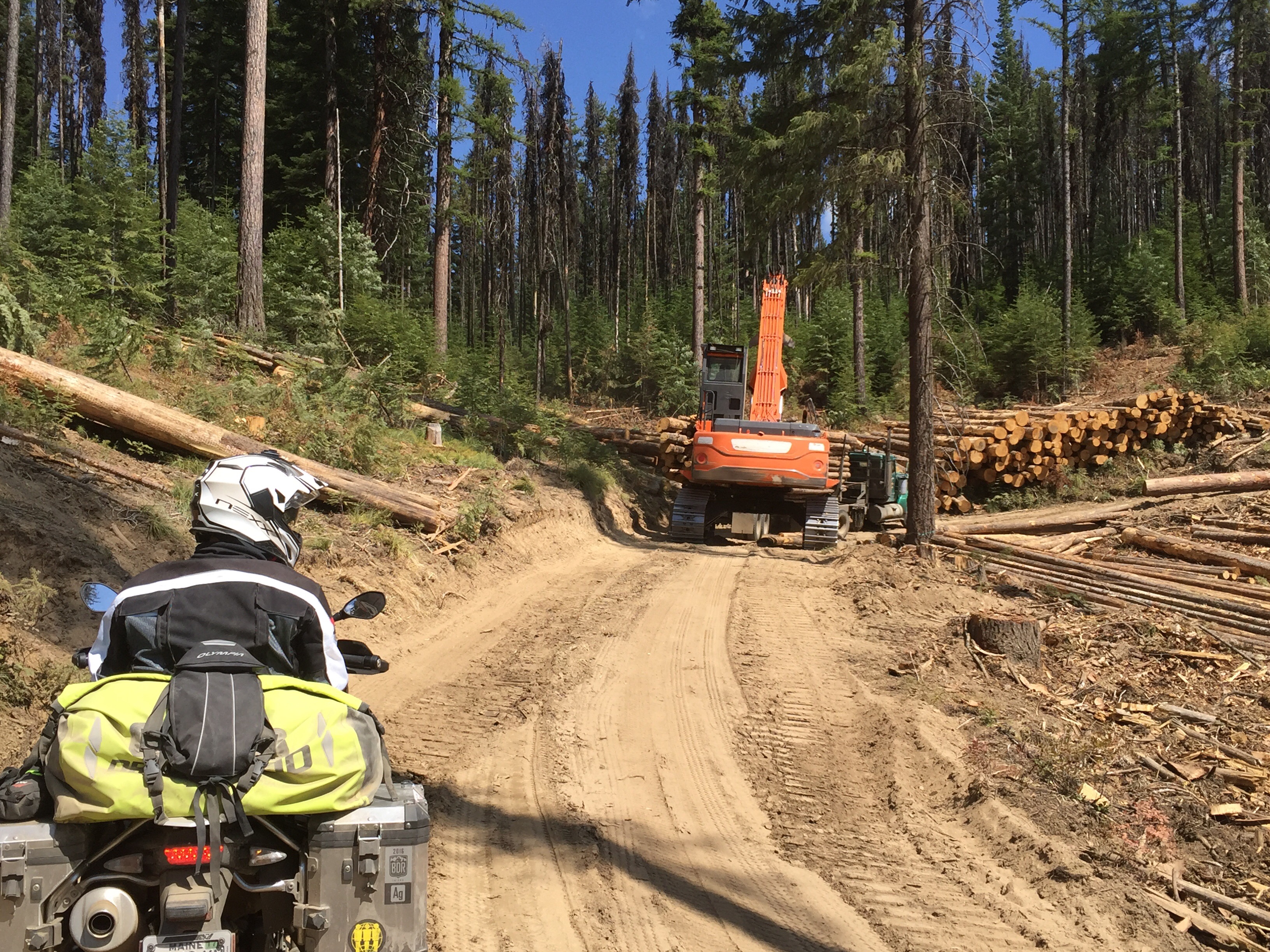 After a short ride we ran into a logging operation on the trail. Let me tell you, a loader and 18 wheeler on a dirt road turn the road to dust. Deep dust and a lot of tree debris. We had to wait 45 minutes to get around the loader. It was quite an art watching him load the truck. It reminded me of a huge game of pick up sticks. The loader actually had to push the 18 wheeler to get him started. For us, several inches of dust for 30 minutes proved challenging and fun. Not to mention the dust cloud he kicked up which prevented us from seeing a dang thing until he kindly pulled aside to let us pass.
