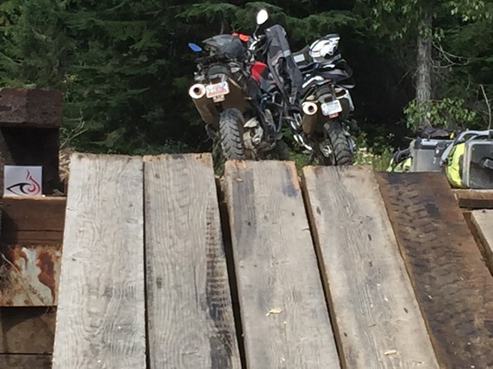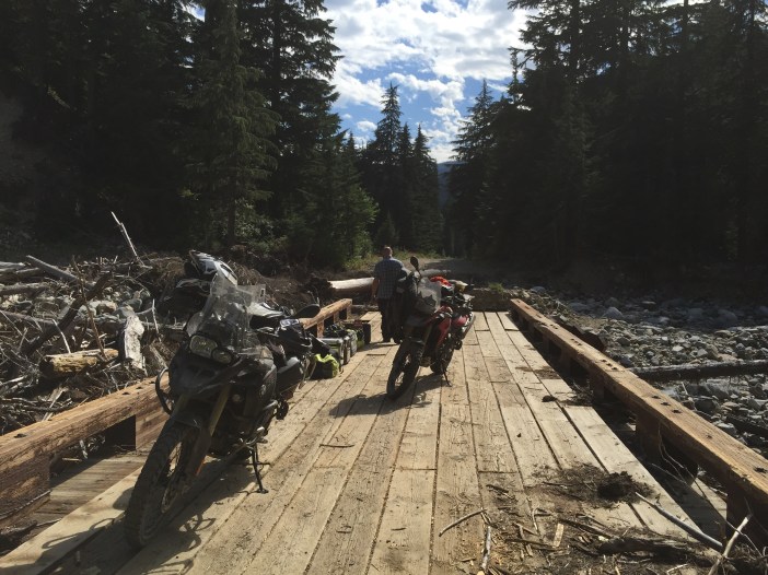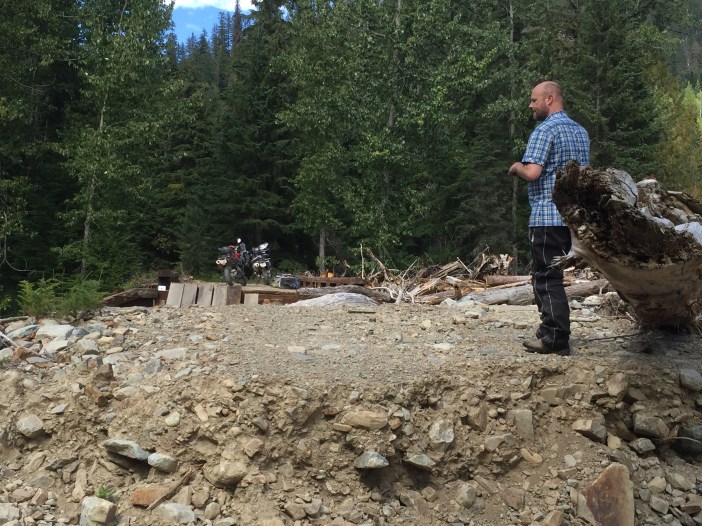 All in all, take your time, have some luck and you’d make it. The final washout, which we had seen pictures of, lived up to the difficulty we read about and some other riders told us. It was much larger, rockier, deeper and had a sketchy climb out onto the bridge someone had made with lumber from the original bridge. Here’s what it looked like after we got Marks bike across. That’s a couple foot drop where Mark is standing.